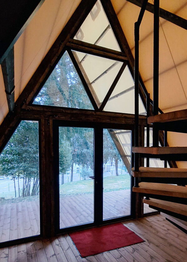 Our glamping tents are made from best quality polyacrylonitrile outdoor tent fabric with good warmth retention and low resistance to light, mildew. Frame is made of solid wood and powder-coated metal to make you feel comfortable even in bad weather.