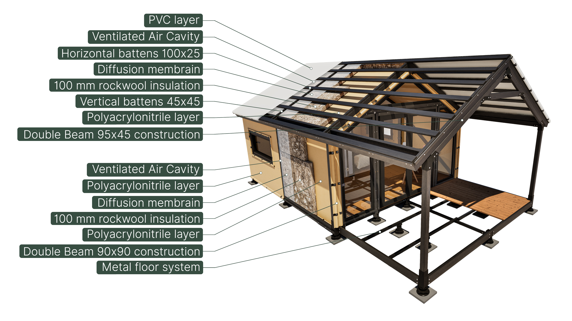 Our glamping tents are made from best quality polyacrylonitrile outdoor tent fabric with good warmth retention and low resistance to light, mildew. Frame is made of solid wood and powder-coated metal to make you feel comfortable even in bad weather.
