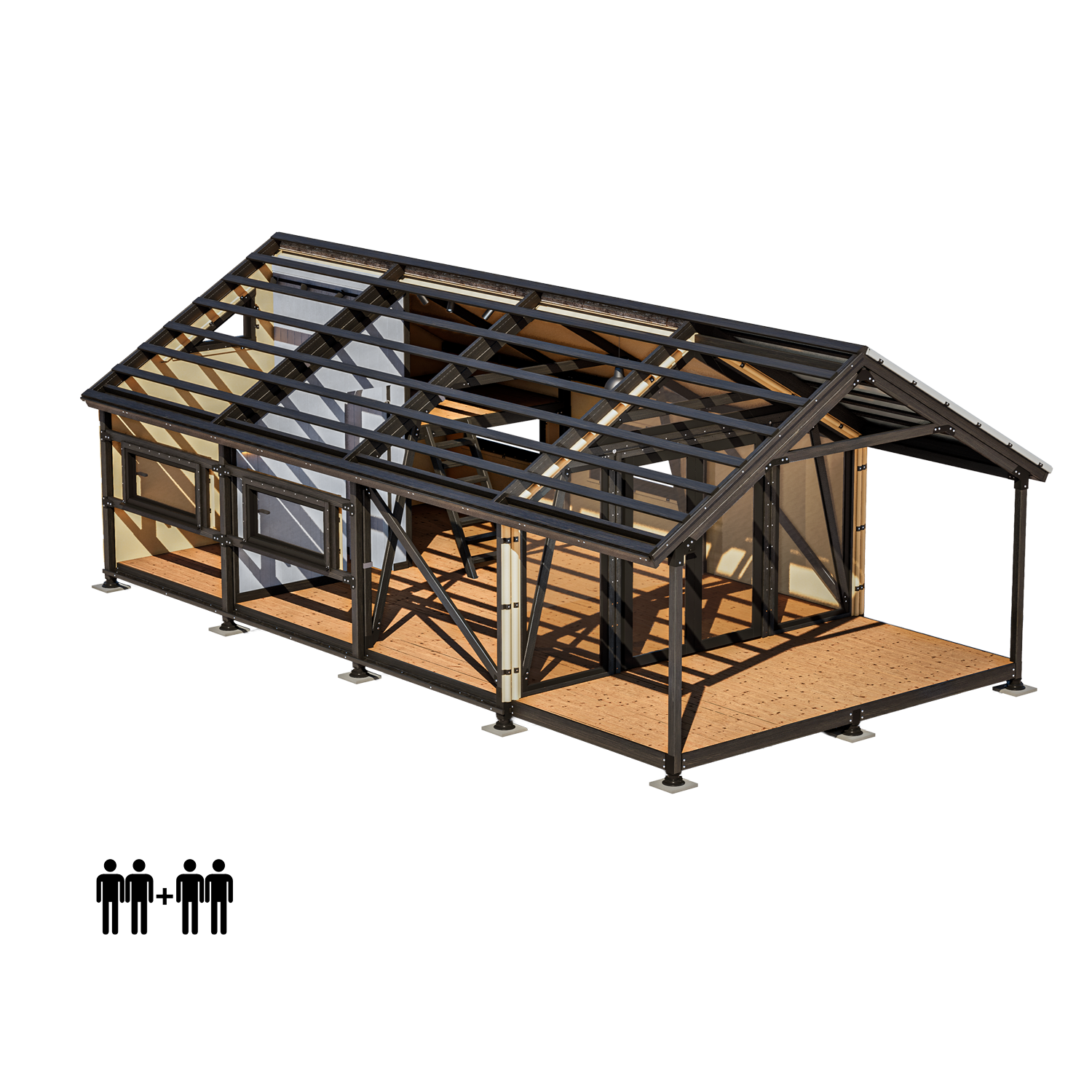 TENT FLOOR SYSTEM - It all begins with a durable floor system - available in two options: a metal frame system or a wooden base system. The metal floor system is constructed from modular, powder-coated sections that resist rust and impact. It's levelled using adjustable plastic feet and a laser, making it ideal for uneven surfaces. The frame connects with galvanized screws and unique brackets, allowing for fast, reusable assembly. It can adjust up to 10 cm with the feet, or up to 1 meter using additional blocks. The wooden floor system is built from strong, high-pressure impregnated panels joined with bolts. It provides a solid, natural-looking foundation and is just as efficient to install. This system also supports pre-fabricated terrace or interior floor panels for quick setup. Both options require no permanent foundations. Their structural stability allows for simplified permitting—even in sensitive environments like nature reserves or coastal zones.