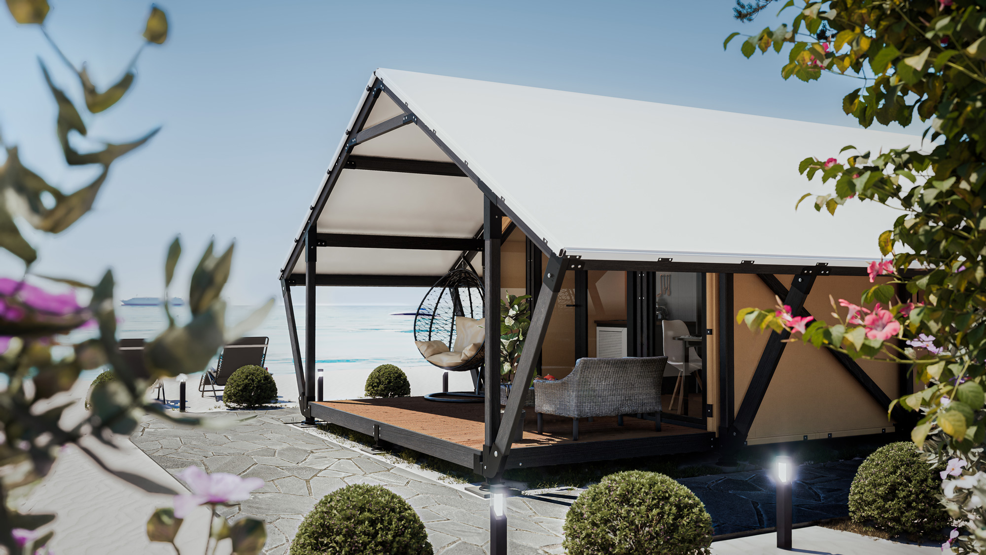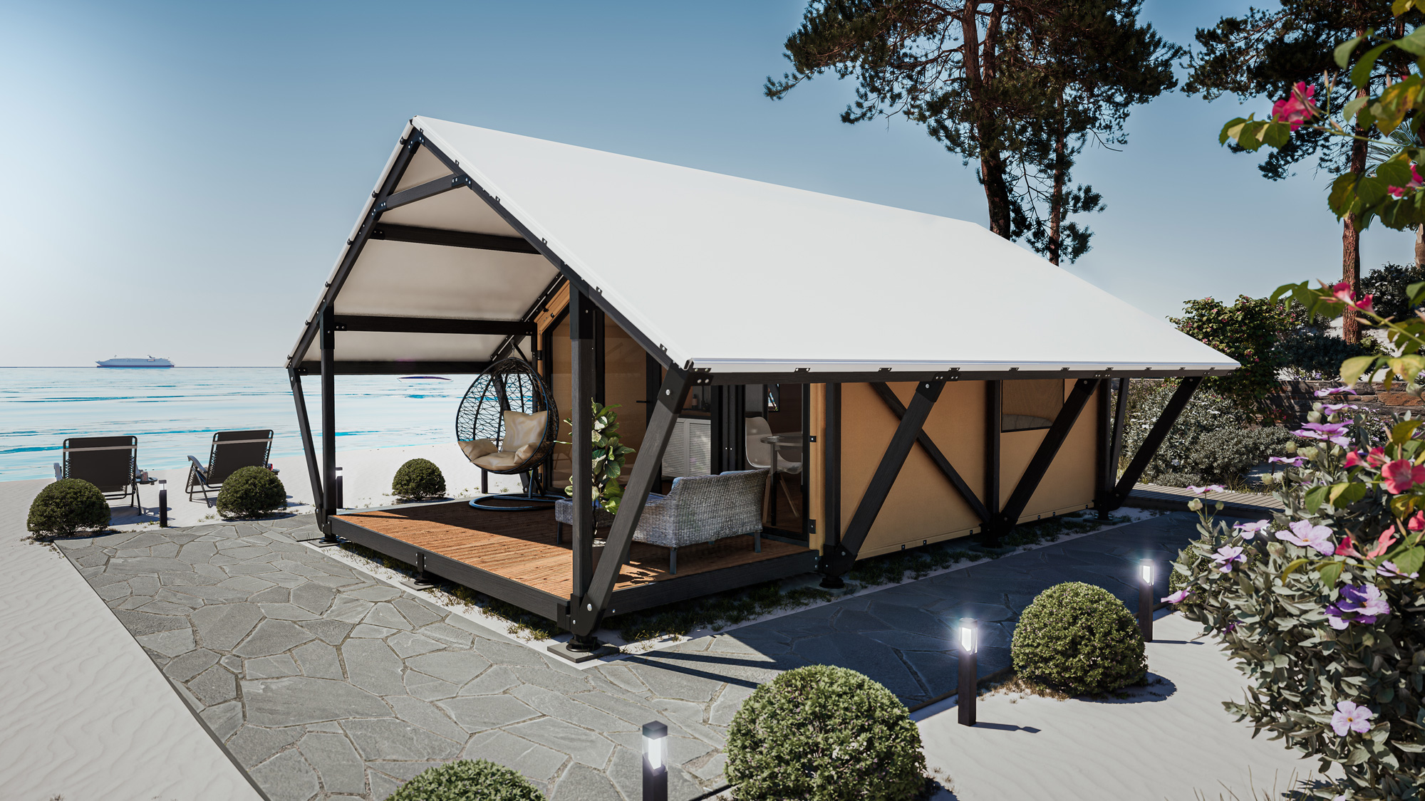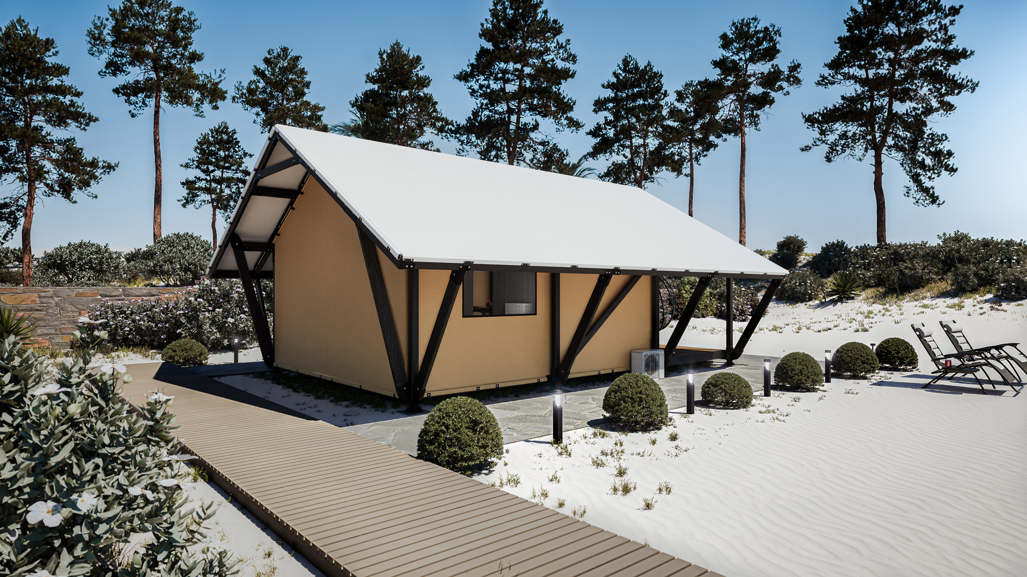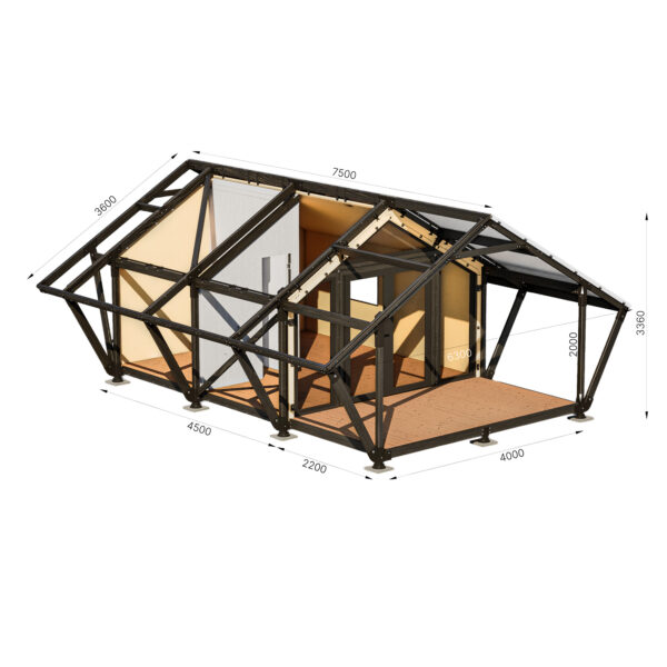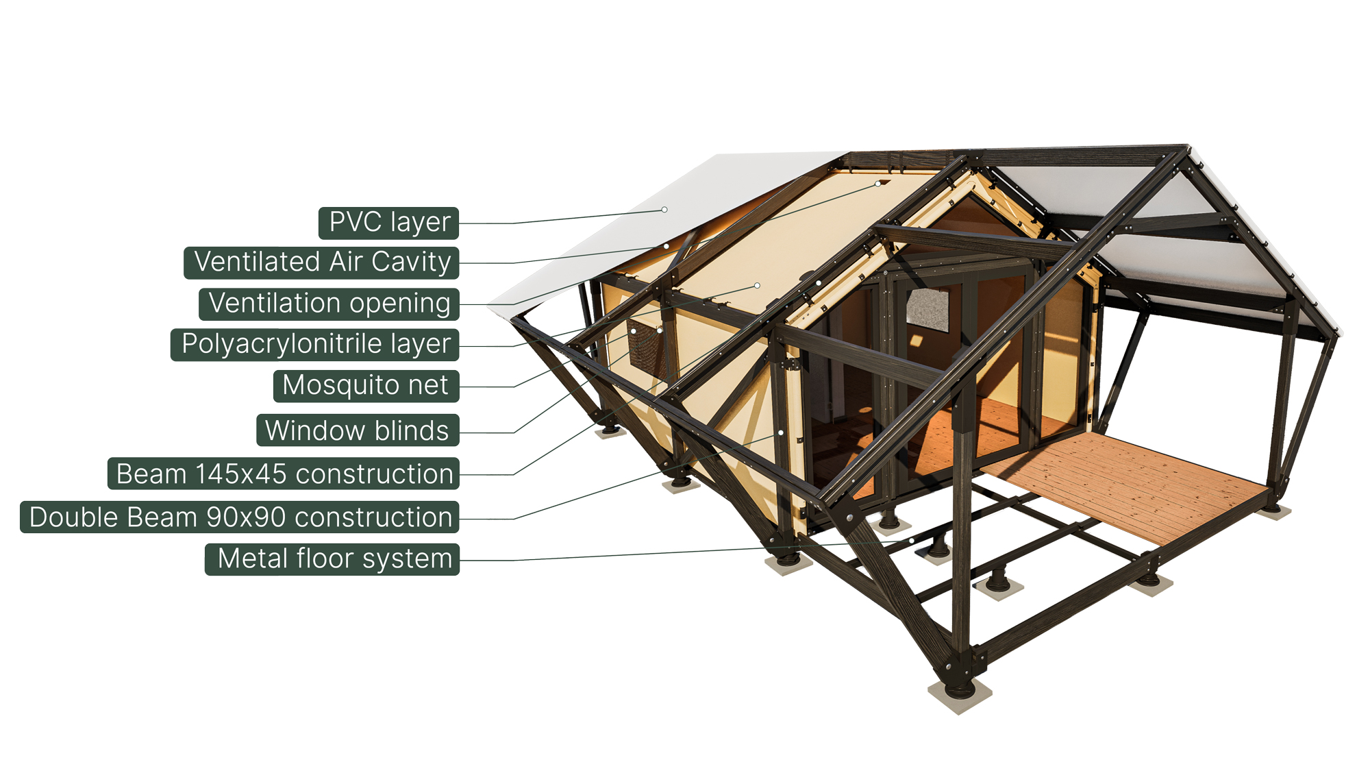 Our glamping tents are made from best quality polyacrylonitrile outdoor tent fabric with good warmth retention and low resistance to light, mildew. Frame is made of solid wood and powder-coated metal to make you feel comfortable even in bad weather.