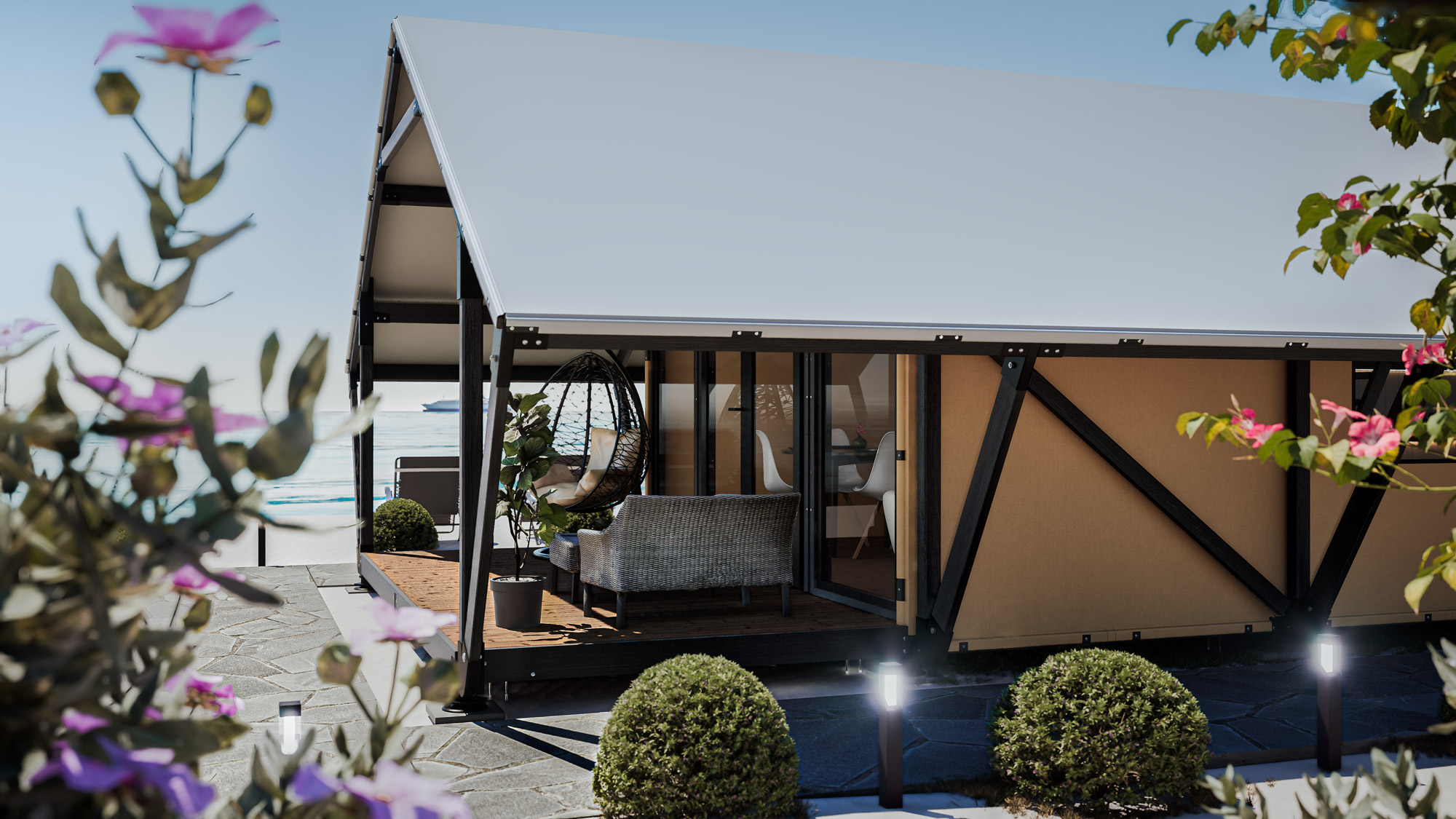 Our glamping tents are made from best quality polyacrylonitrile outdoor tent fabric with good warmth retention and low resistance to light, mildew. Frame is made of solid wood and powder-coated metal to make you feel comfortable even in bad weather.